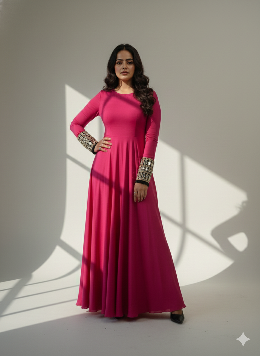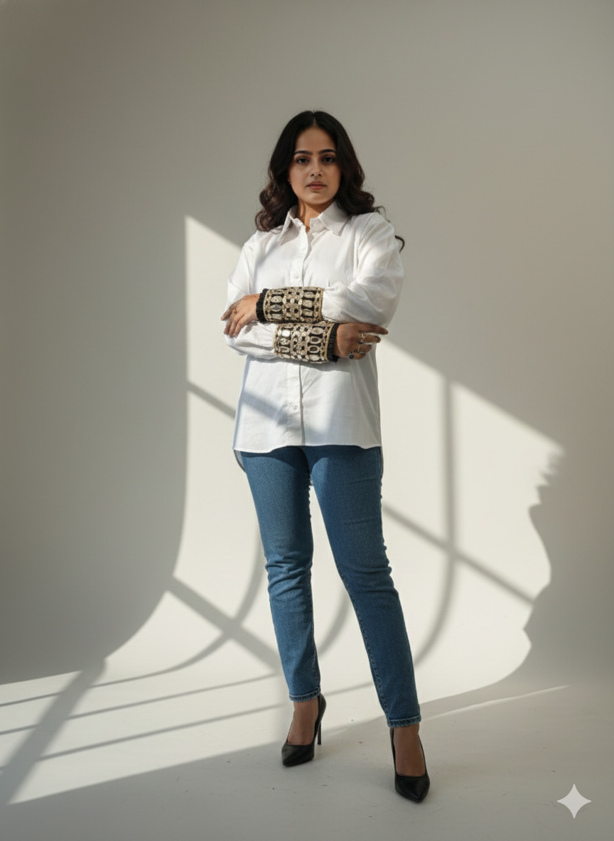 These black mirror cuffs are statement accessories featuring intricate gold embroidery and reflective mirror-work. Designed to slide over the wrists, they add a luxurious, regal touch to any long-sleeved garment, instantly elevating a simple outfit for festive or formal occasions.