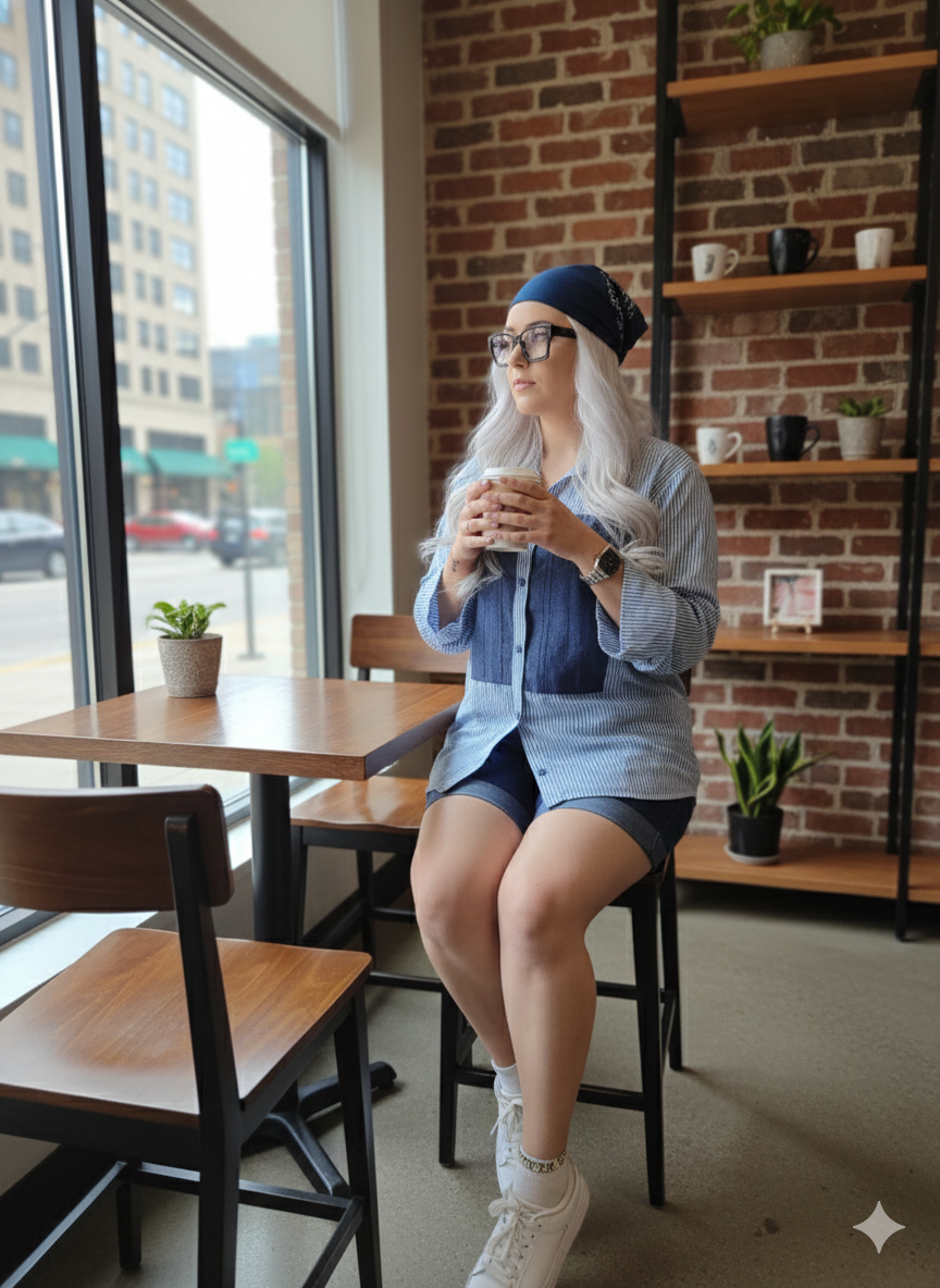 This blue stripe cotton shirt features a relaxed fit with a classic button-down front and a pointed collar. It is defined by a bold, central denim patch detailing that creates a modern, mixed-media contrast against the fine vertical stripes.