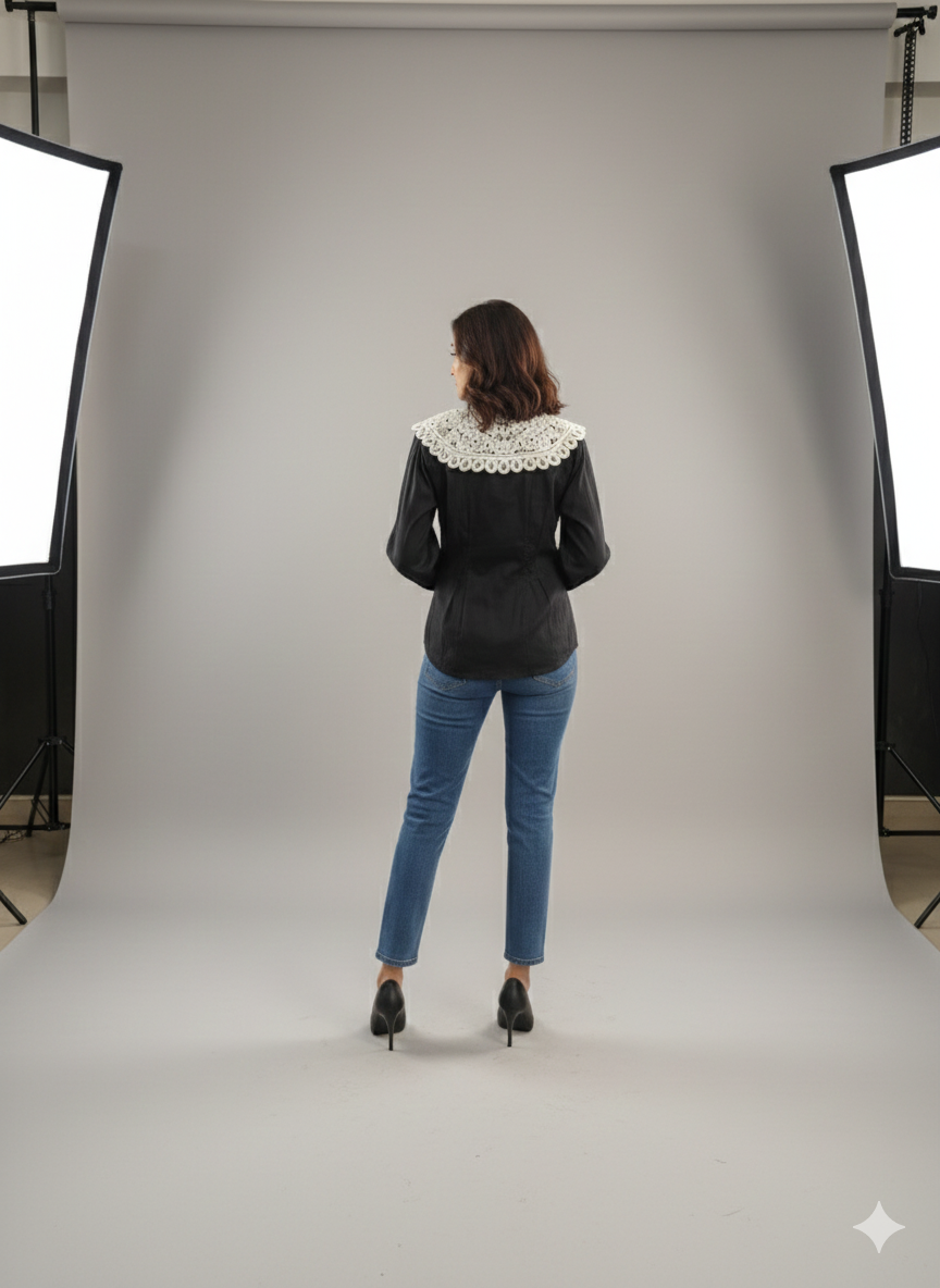 This cream embroidered tie-up collar features an intricate, oversized lace pattern with scalloped edges. Designed as a detachable statement accessory, it includes a delicate front-tie closure that allows it to be easily layered over contrasting tops for a vintage-inspired look.