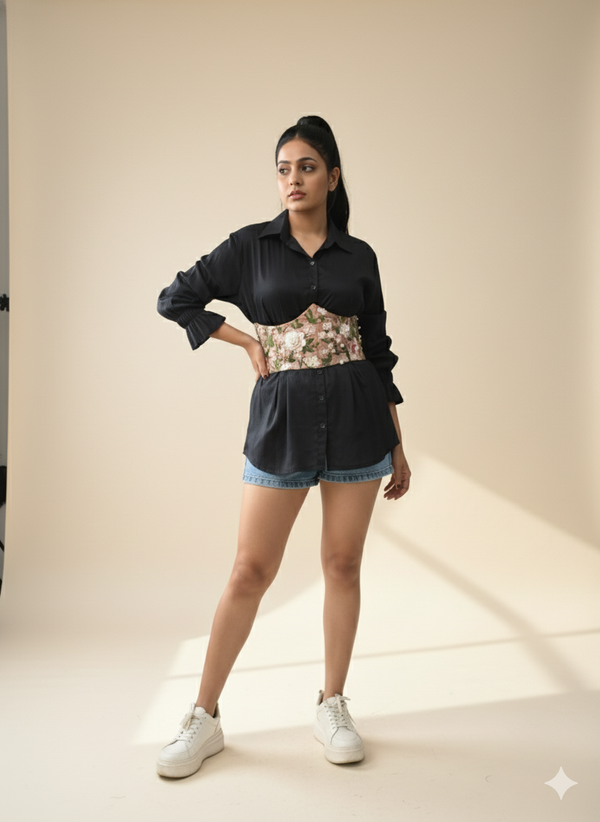 This peach floral corset belt is an elegant, wide-waisted accessory featuring intricate floral embroidery. It is designed with a contoured "V" shape at the top to accentuate the bustline and provide a structured, cinched-in silhouette.