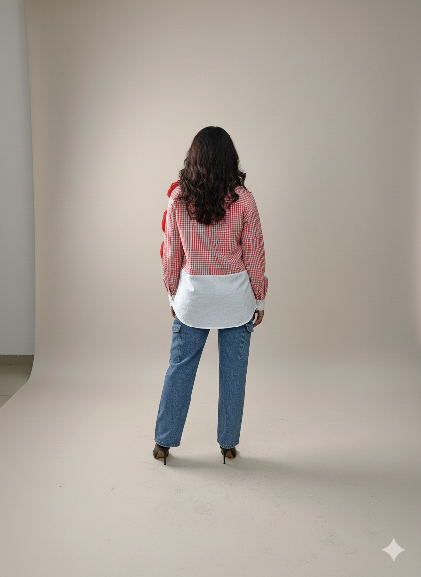 This red check cotton shirt features a unique color-blocked design with a crisp white lower panel and matching cuffs. It is distinguished by three oversized, 3D red flower detailing accents cascading down the right side for a bold, artistic statement.